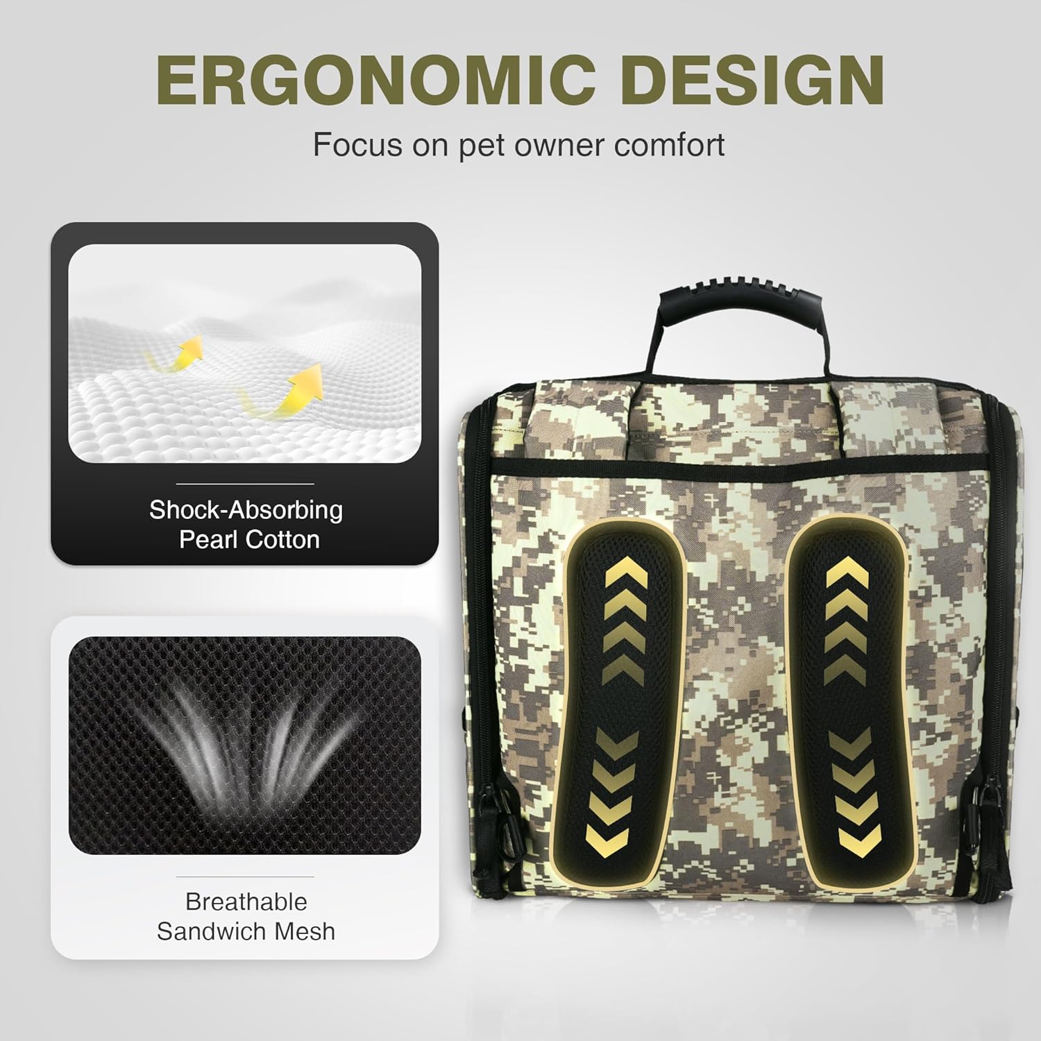 - ERGONOMIC DESIGN: The shoulder straps and the back of the backpack dog carrier are made of pearl cotton, which has a cushioning effect and can effectively absorb shock and vibration and reduce back pressure. External wrapping sandwich mesh, which has good breathability, can effectively reduce back sweating. The seven-wire handle on the top of the cat backpack provides multiple grip points, and effectively dispersing the pressure on the hand, thereby enhancing grip.