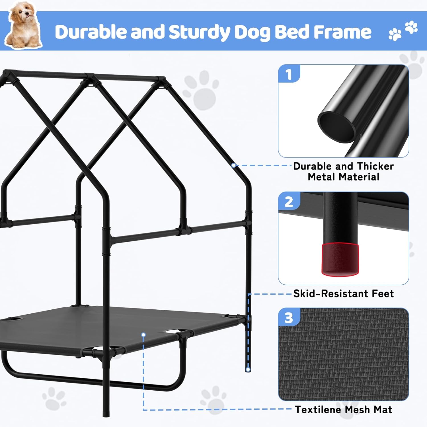 - 【Durable and Versatile Design】Crafted from heavy-duty, powder-coated steel, the reinforced frame and elevated dog bed deliver great load-bearing strength and rock-solid stability, ensuring excellent support for even larger breeds.