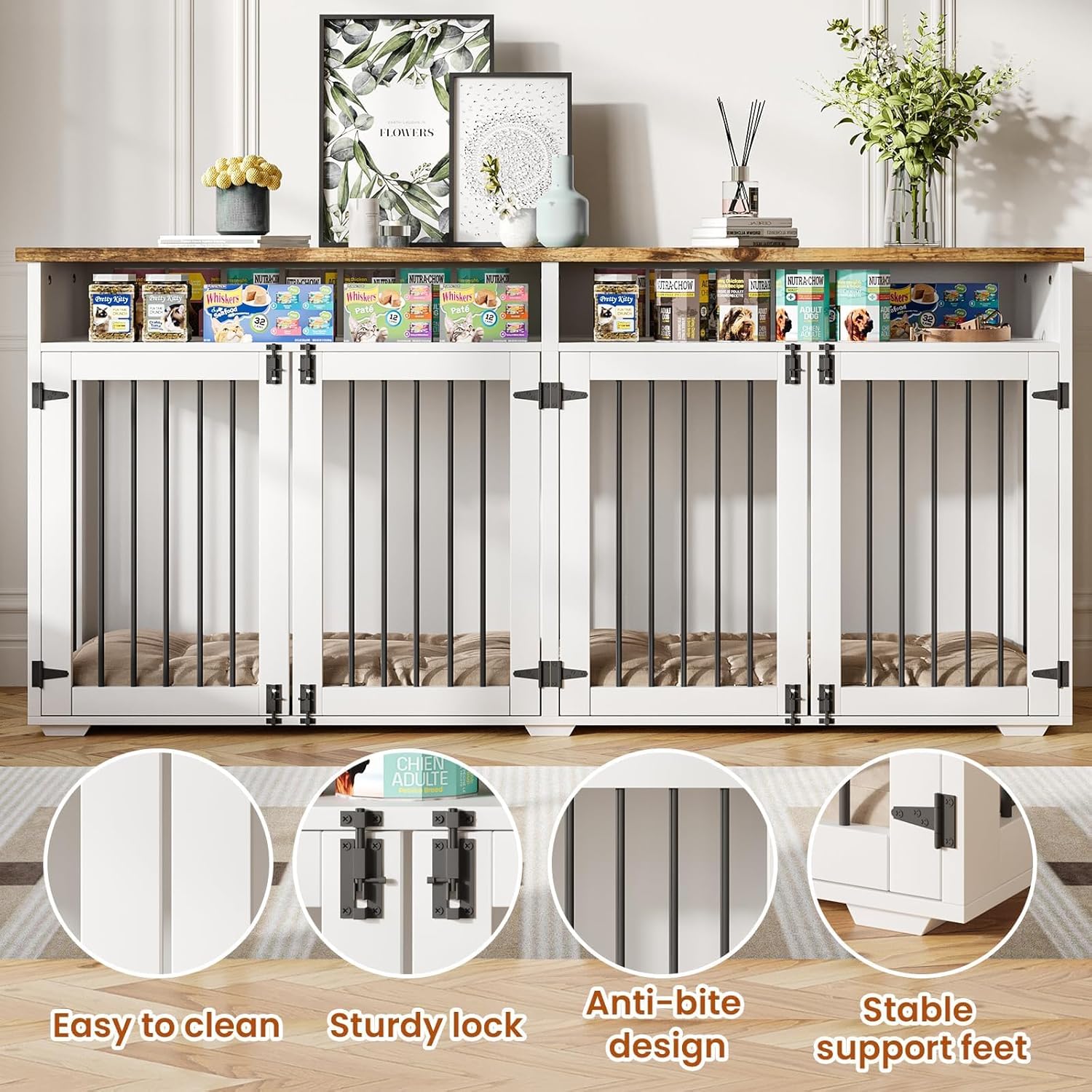 72'' Dog Crate Furniture for 2 Dogs, Wooden Dog Cage with Storage Compartment, Indoor Dog Kennel with 4 Doors for Large/Medium Dogs, White