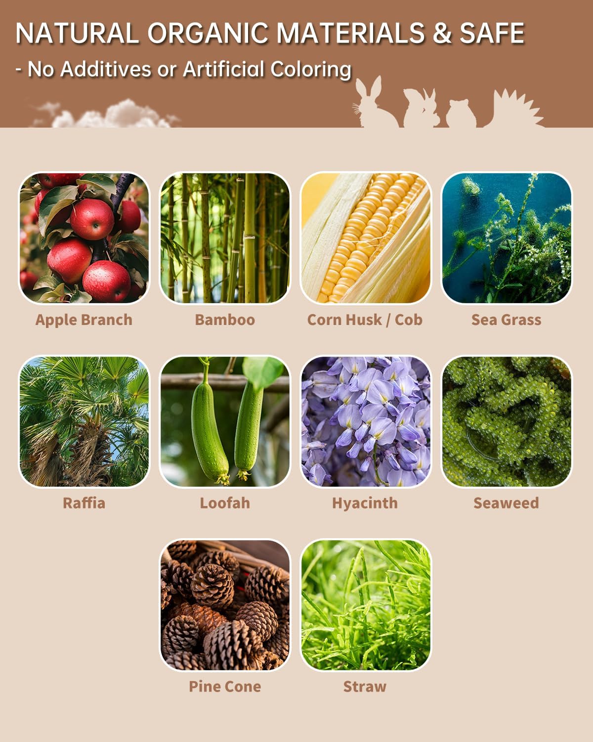 - 31 Pcs Various Chew Toys: The set includes 2 Seagrass-Wrapped Sweet Bamboo Sticks, 2 Seagrass-Wrapped Apple Sticks, 1 Paper Raffia, 2 Apple Wood Blocks, 2 Sweet Bamboo Sticks, 2 Apple Sticks, 4 Corn Husks, 2 Loofah Slices, 2 Papaya Wood Sticks, 2 Seagrass Twists, 1 Woven Seagrass Carrot, 1 Corn Cob, 1 Hyacinth Ball, 1 Seaweed Ball, 1 Pine Cone, and 1 Grass Bed.