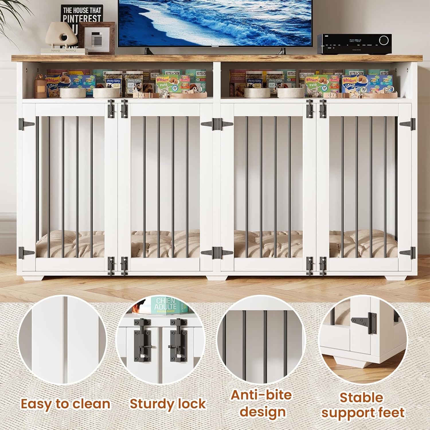 63'' Dog Crate Furniture for 2 Dogs, Wooden Dog Cage with Storage Compartment, Indoor Dog Kennel with 4 Doors for Large/Medium Dogs, White