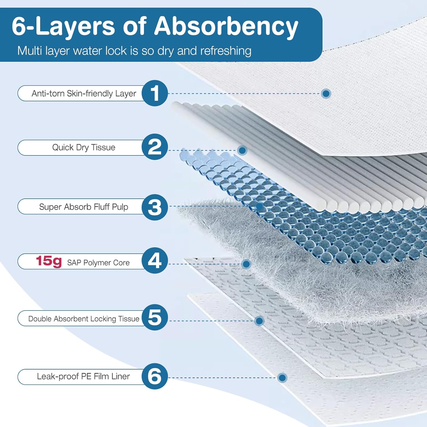 - 【Ultra Absorbency & Leak-Proof Protection】6-Layer Core Design – containing 15 g of SAP Super Absorbent Polymer And Fluff Pulp Hold More Liquid Up To 10 Cups(1000ml).Leak-Proof Backing – Waterproof bottom layer ensures no spills or stains on carpets, hardwood.