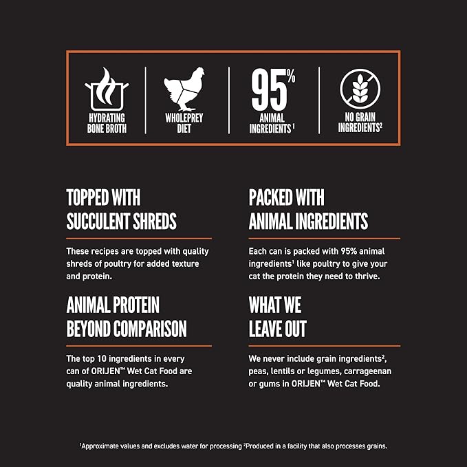 - The first 8-9 ingredients in these ORIJEN cat food recipes are animal ingredients.