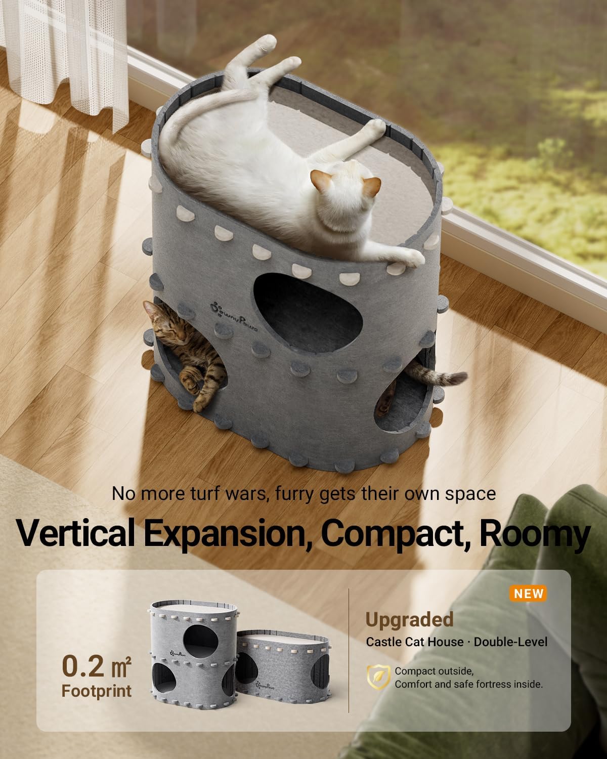 DownyPaws Cat House for Indoor Cats, 2-Storey Foldable Cat Bed Cave, Felt Cats Tunnel Bed Condo, Castle Kitten Cube Hideaway for Multicats, Scratch Resistant, Light Gray