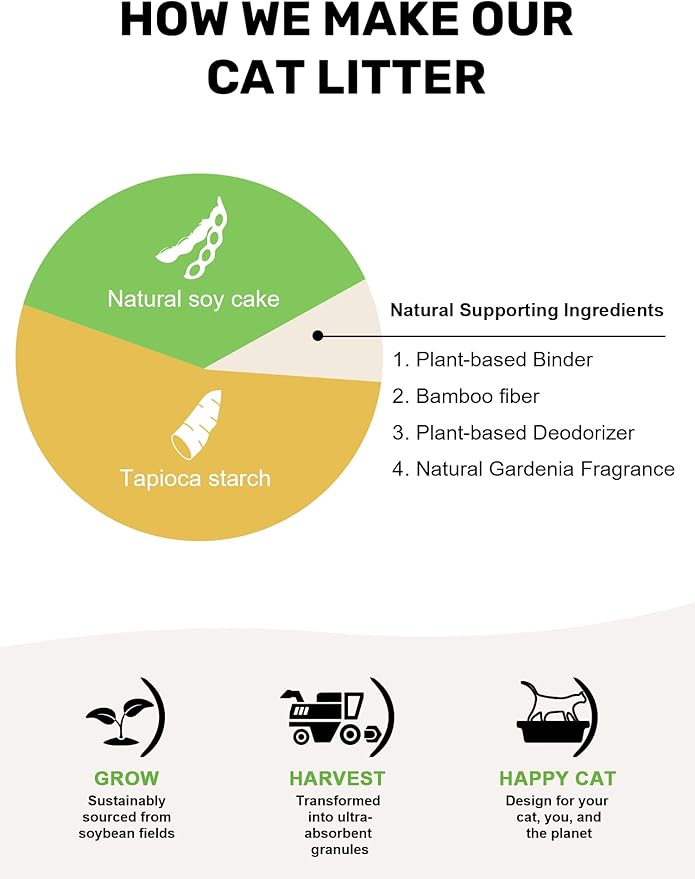 - Natural Plant-Based Formula - Crafted from premium soybean dregs, corn starch, and bamboo fibers. 100% biodegradable and water-soluble, it dissolves in 30 seconds and composts within 6 months. For sensitive cats and eco-conscious homes.