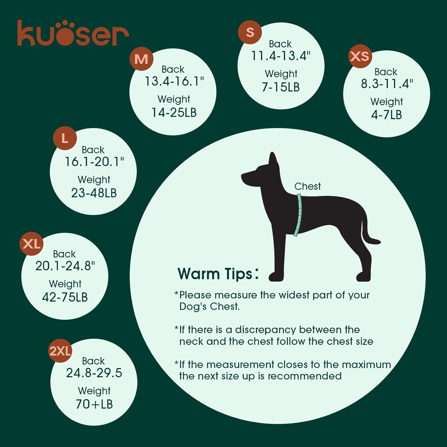- SIZE GUIDE: X-Small (Back:8.3-11.4'', Weight:4-7 LB), Small (Back:11.4-13.4'', Weight:7-15 LB), Medium (Back:13.4-16.1'', Weight:14-25 LB), Large (Back:16.1-20.1'', Weight:23-48 LB), X-Large (Back:20.1-24.8'', Weight:42-75 LB), XX-Large (Back:24.8-29.5'', Weight:70+ LB)