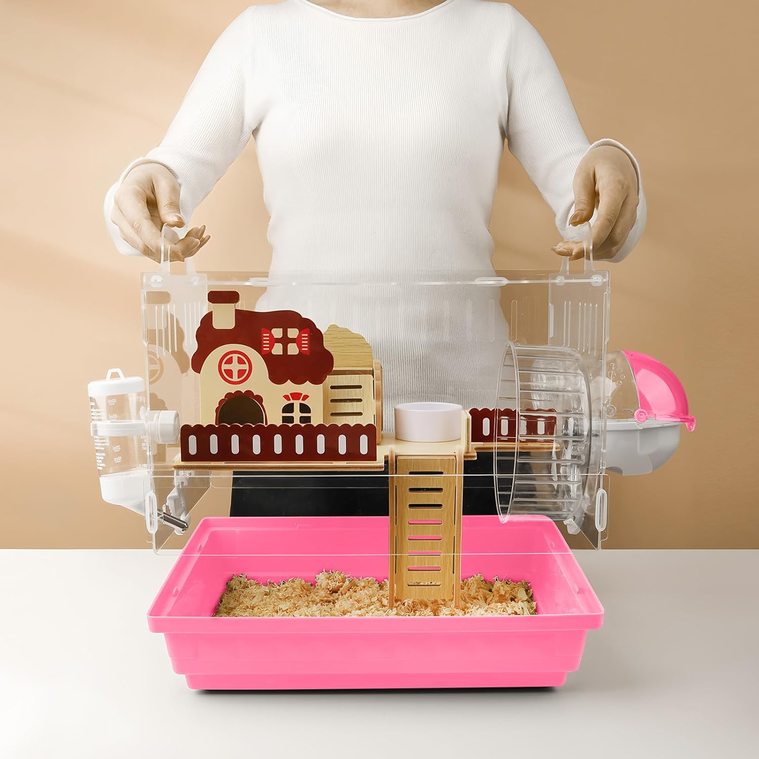 - 【Includes Accessories & Toys】This acrylic hamster cage encompasses everything needed for pet care.A wooden garden house that satisfies the hamster's instinct to dig. Inside the mice cage, you'll find a food bowl, stairs, an extra-large 18cm exercise wheel, a bridge toy, an external bathing area, and a water bottle with a steel ball to prevent leaks. This makes it an ideal gift choice, especially for children.