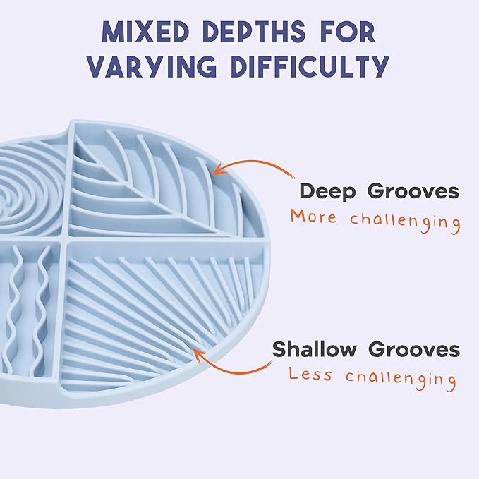 - MIXED DEPTHS FOR VARYING DIFFICULTY - The deep grooves of this universal feeder mat offer greater challenge, while the shallow grooves provide easier access to everything from peanut butter to meats, fish, fruits, and veggies. Cats, kittens, dogs and puppies of all breeds and sizes will fall in love with the stimulation of the four textured sections!
