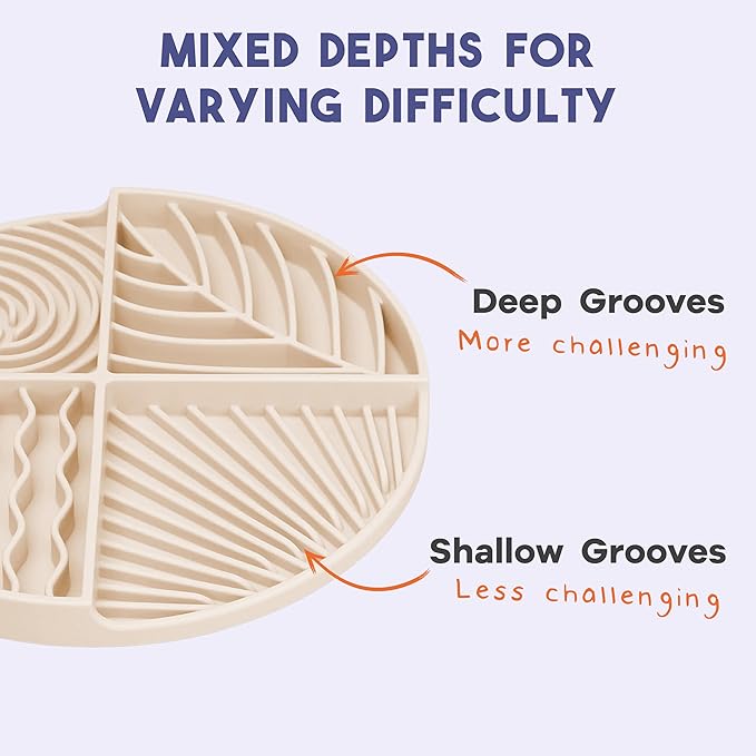- MIXED DEPTHS FOR VARYING DIFFICULTY - The deep grooves of this universal feeder mat offer greater challenge, while the shallow grooves provide easier access to everything from peanut butter to meats, fish, fruits, and veggies. Cats, kittens, dogs and puppies of all breeds and sizes will fall in love with the stimulation of the four textured sections!