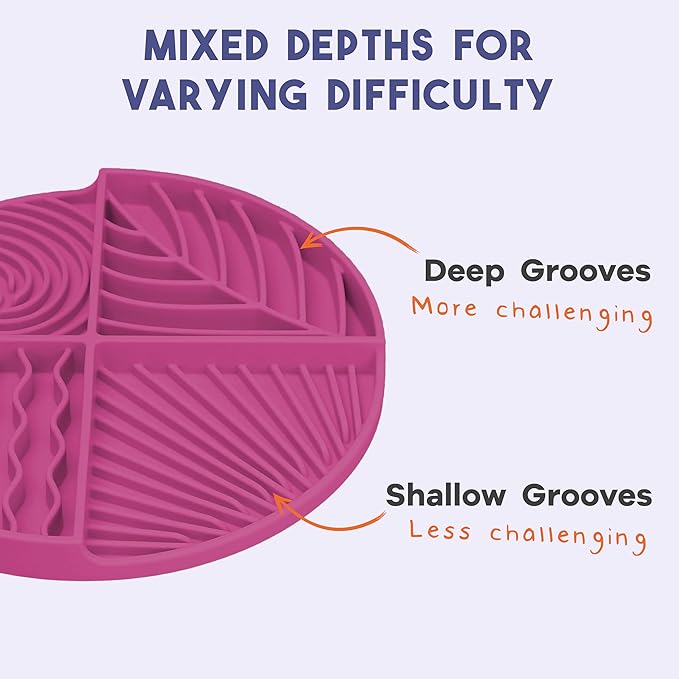 - MIXED DEPTHS FOR VARYING DIFFICULTY - The deep grooves of this universal feeder mat offer greater challenge, while the shallow grooves provide easier access to everything from peanut butter to meats, fish, fruits, and veggies. Cats, kittens, dogs and puppies of all breeds and sizes will fall in love with the stimulation of the four textured sections!