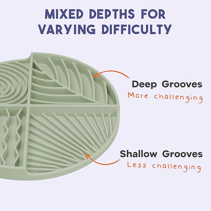- MIXED DEPTHS FOR VARYING DIFFICULTY - The deep grooves of this universal feeder mat offer greater challenge, while the shallow grooves provide easier access to everything from peanut butter to meats, fish, fruits, and veggies. Cats, kittens, dogs and puppies of all breeds and sizes will fall in love with the stimulation of the four textured sections!