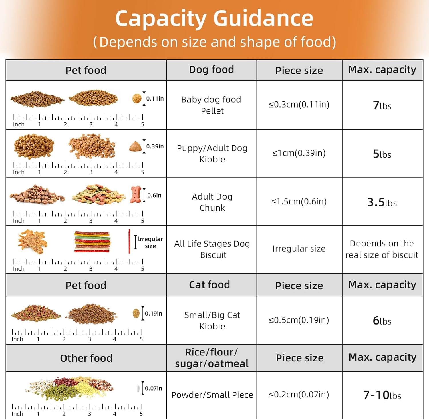 - SUPER LARGE CAPACITY : The airtight cat food container is designed with a large nozzle, so whether it is small or large pieces of food, it can be easily poured out without shaking the barrel. The handle design makes it easy to use and carry indoors and outdoors. It is also convenient to hold with one hand and tip the bucket to pour out food. The size of the pet food container is 14*12*8 inches, with a capacity of 5 liters. It can store pet food for 5 -7LBS, rice, dry food, cereals, etc. is about 10LBS, depending on the size and shape of the food. Can be easily stored and effectively save valuable space whether indoors, outdoors or during travel.