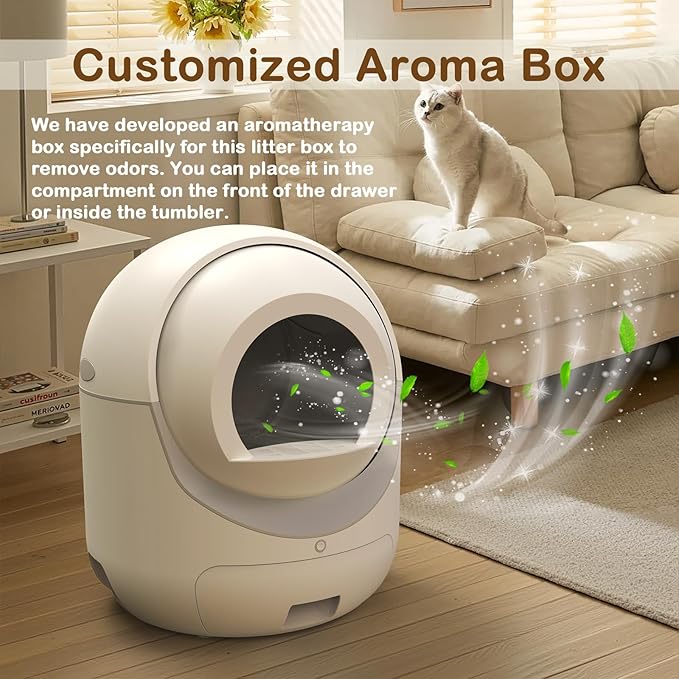 - Advanced Odor Control: Equipped with a separate aromatherapy box, this self cleaning cat litter box neutralizes unpleasant smells and keeps your home fresh and inviting. Enjoy a clean, odor-free space, without the need for constant maintenance