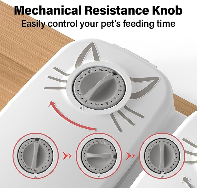 - High-quality Material:Pet food dispenser is made of safe and high quality ABS shell material, no odor. Irreversible knob design, durable dual springs to prevent pets from opening the lid. Stable rubber base protects the floor and prevents the bowl from sliding without tipping over when your pet is eating