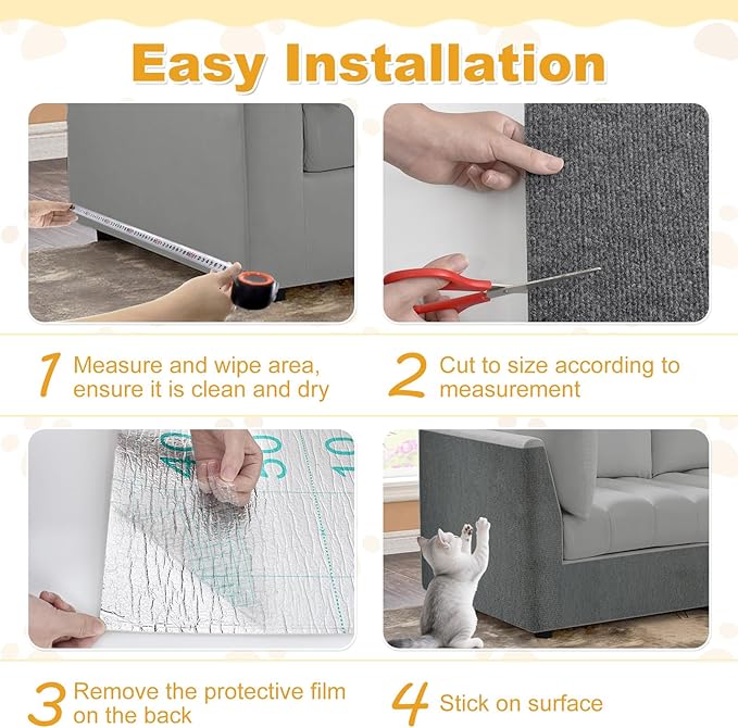 - ๐๐๐ ๐๐๐ญ ๐๐๐ซ๐๐ญ๐๐ก๐ข๐ง๐ ๐๐๐ญ๏ผThe DIY cat scratch furniture protector is a flexible and trimmable solution that does more than just protect furniture.You can cut and stick the cat couch protector onto cat scratching posts,trees,towers,scratchers or wall shelves,reducing the cost of purchasing additional pet supplies.Stick the furniture protector on pet stairs or ramps to give extra grip, making it safer for older cats/dogs to move around.The couch protector from cat claws is a great choice for pet-friendly homes due to its customizability and versatility.