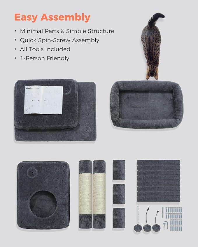 - Sturdy and Safe: The large cat tree boasts a large base and 3.4" thick support posts for unmatched stability. Includes all necessary tools and an illustrated manual - most customers complete assembly in under 15 minutes without additional equipment.