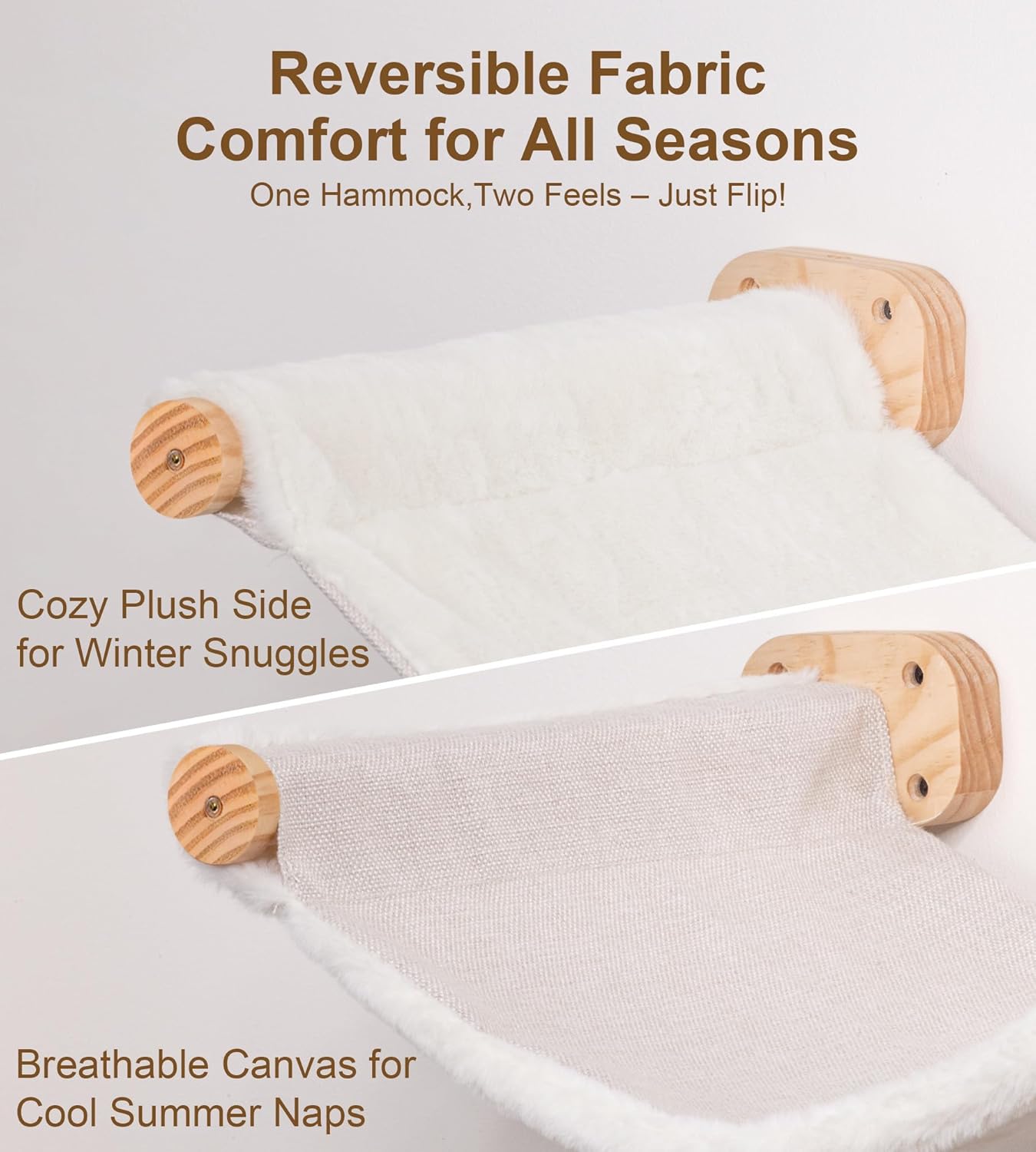 - Dual-Sided Fabric for Year-Round Comfort: Our wall-mounted cat hammock features a reversible design with breathable canvas for summer and soft plush for winter; Whether your cat likes to stay cool or cozy up, this hammock offers all-season comfort with one quick flip.