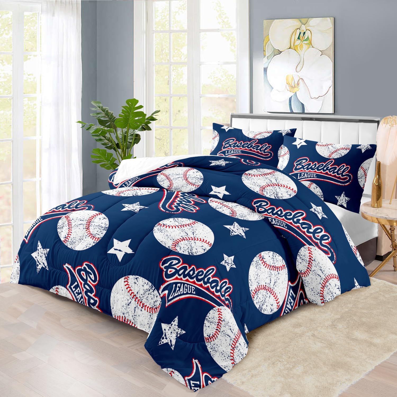 Baseball Comforter Set Queen,Sports Bedding Sets for Boys,Blue Sports Comforter Queen Bedroom Decor,Baseball Bedding Teen for All Seasons,Blue Quilt Kids Bedroom Decor