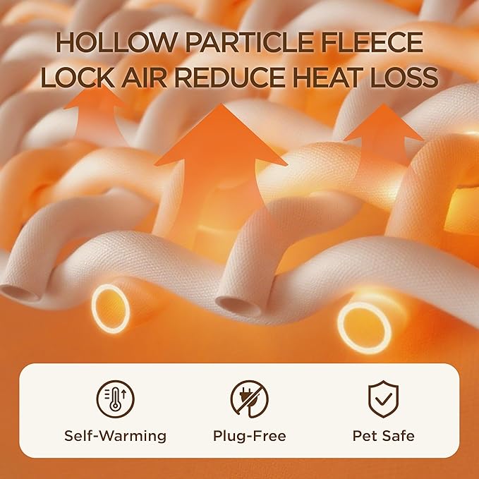 - Self-Warming Fabric: Hollow-core heat-trapping fibers lock in still air to reduce heat loss and naturally sustain your pet’s body warmth, keeping them cozy through winter naps.