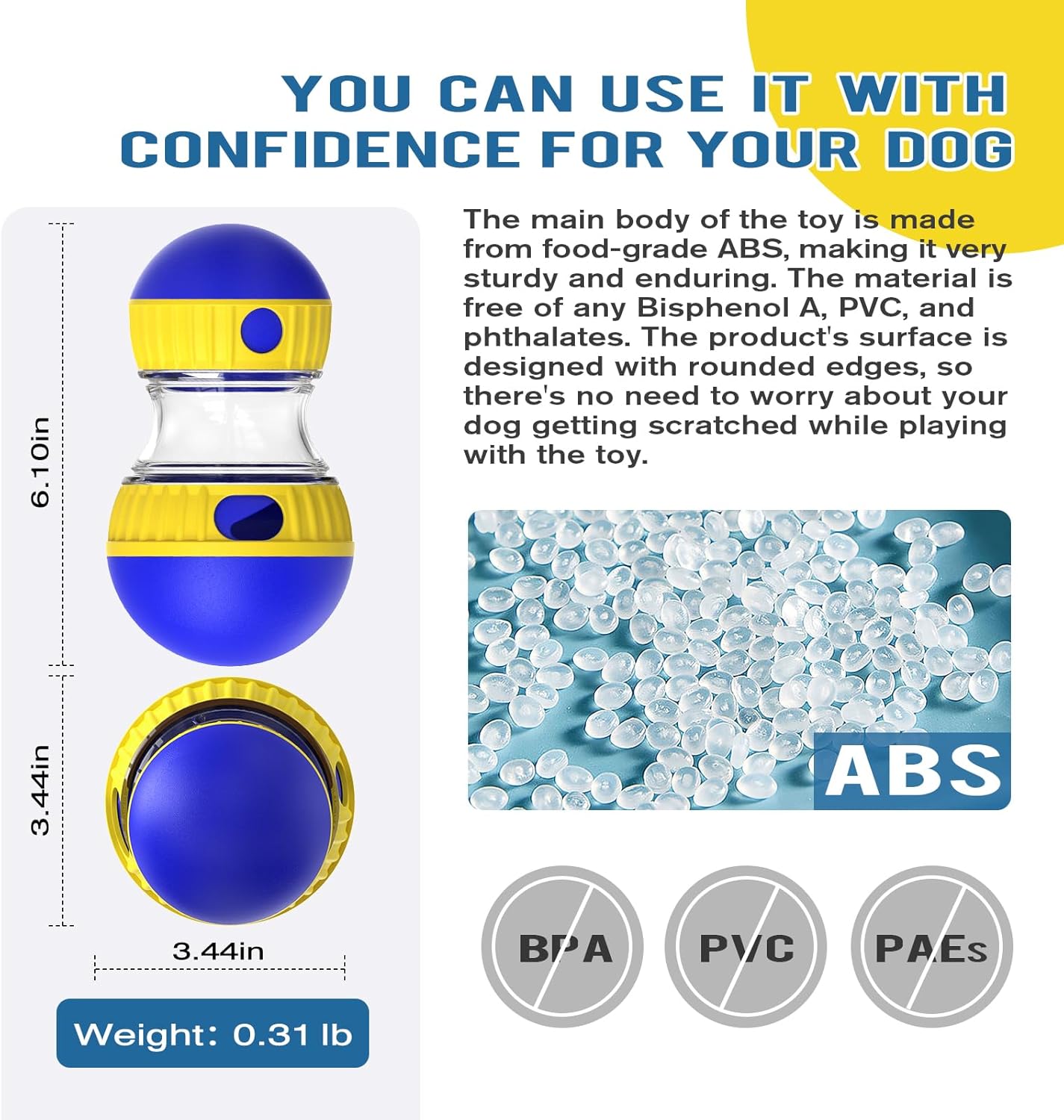 - [Treat Distribution] Our food slow dispenser has differently sized spheres at both ends. As dogs push the toy, it moves within a fixed area, allowing dogs to continuously chase and play with it. During movement, food is dispensed from the food holes on both sides of the toy.