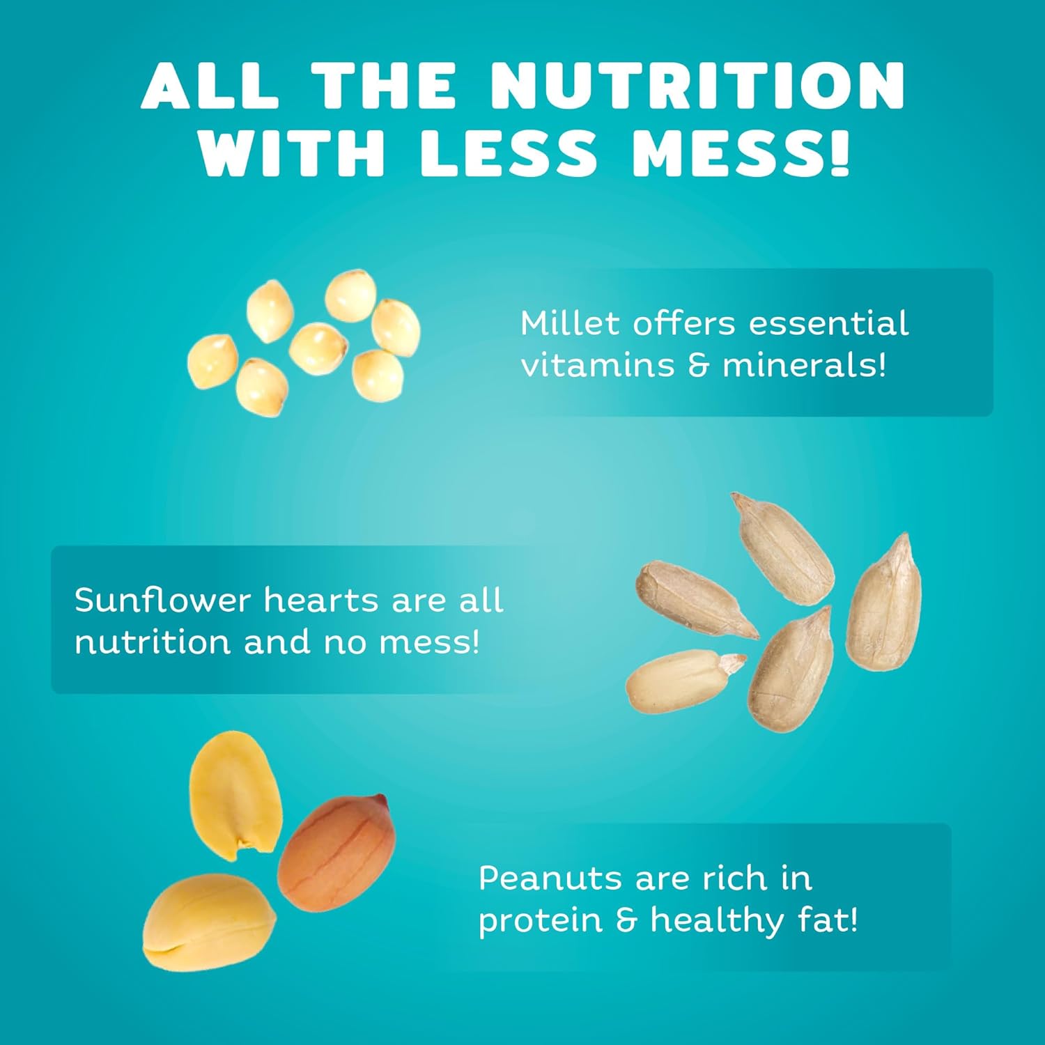 - No Mess Formula – Shell-free blend with sunflower hearts, chips, and peanut pieces helps keep feeding areas clean