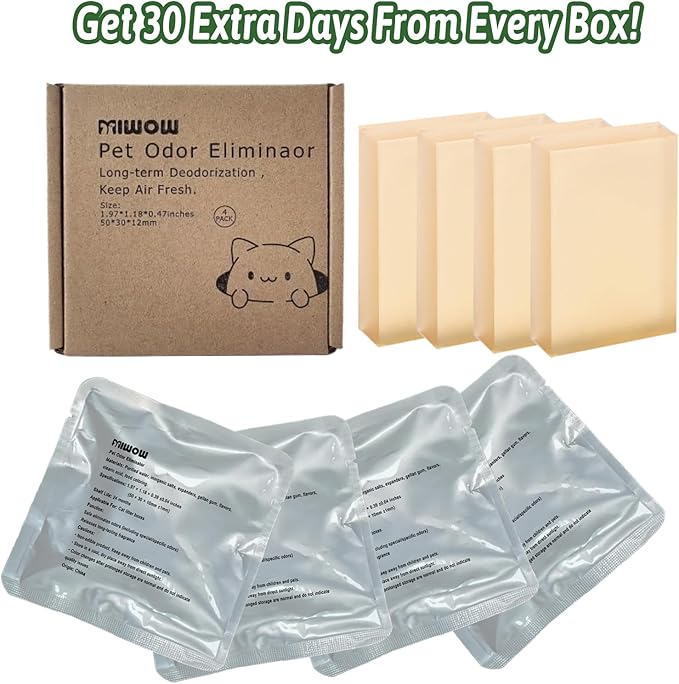 - 1. 30-Day Hassle-Free Protection "Miwow Litter Deodorizer Replacement slowly releases active odor-eliminating ions to continuously absorb ammonia and fecal odors for 30 days – no daily spraying needed!