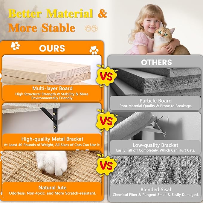 - Rock-Solid Stability & Unshakable Durability! Breathe easy knowing your cat explorer plays on a cat wall shelves, not just furniture! Crafted from premium, multi-layered natural wood with reinforced critical joints, our cat shelves are engineered for unwavering strength. Cat wall furniture confidently support hefty cats up to 40lbs – watch your majestic Maine Coon or playful Ragdoll leap, lounge, and conquer with pure, carefree joy. Your cat's safety isn't just our responsibility; it's our ironclad promise of peace of mind for you.