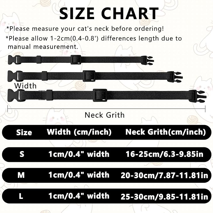 - Adjustable and Bright Colors: Our stretch kitten collars come in 3 sizes and 12 colors for choice, suitable for vast majority of cats. Size S: 16-25CM; Size M:20-30CM; Size L: 25-30CM. 12 simple classic colors, fashionable and charming.