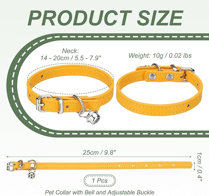 - Material: PU Leather, Metal Buckle; Color: Gold; Size: 25 x 1 cm / 9.8 x 0.4 Inch (L x W); Neck: 14 to 20 cm / 5.5 to 7.9 Inch; Weight: 10g / 0.02 lbs; Packing List: 1 Pcs x Pet Collar with Bell and Adjustable Buckle