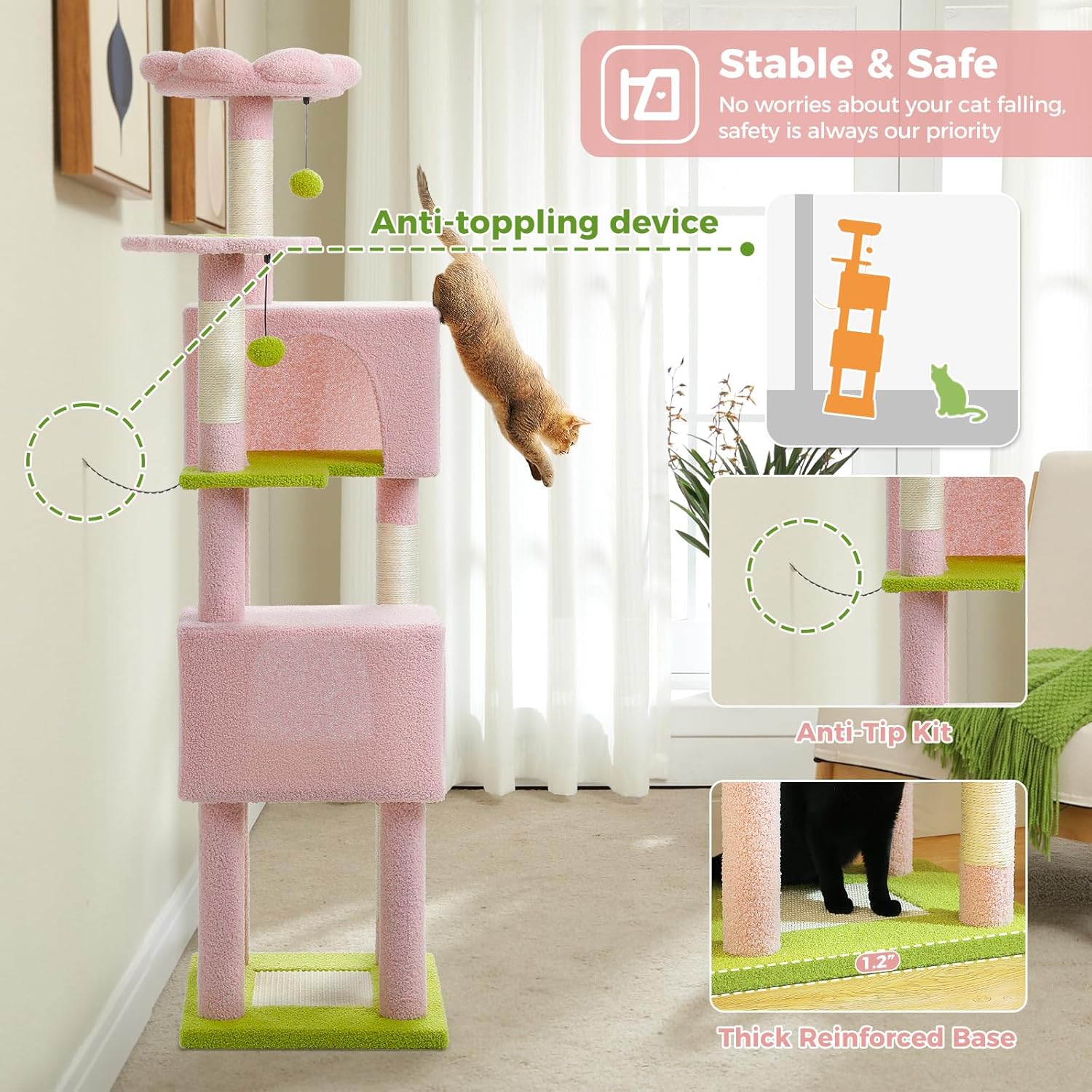 Flower Cat Tree, 62-Inch Tall Multi-Level Cat Tower with Scratching Posts for Large Indoor Cats, Plush Bed w/Padded Perches, Scratching Pad & 2 Green Pompoms, Pink