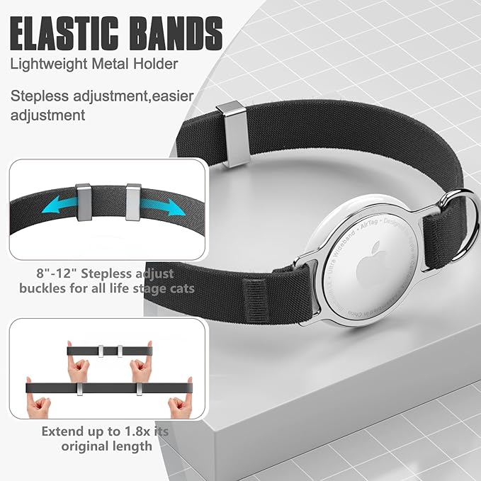 - Stepless Adjustment: Designed for a perfect fit and aesthetics, the cat collar AirTag holder provides seamless comfort with its smooth, hassle-free adjustment. Say goodbye to guessing or pulling. NOTE: This is not a breakaway collar, it uses elastic properties to prevent your cat from choking.