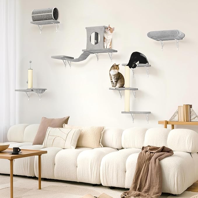 - SPACE SAVING - Use our wall mounted cat shelves to optimize your space. They are perfect for small or modern rooms, saving your floor space. This design allows your cat to climb and jump while minimizing the impact on your living area, so both you and your cat can enjoy leisure time together.