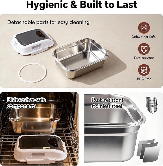 - Airtight & Easy to Clean Design: Sealed silicone ring helps maintain freshness and reduce moisture exposure. Smooth stainless steel surface resists stains and is easy to clean, keeping your pet food storage hygienic with minimal effort.