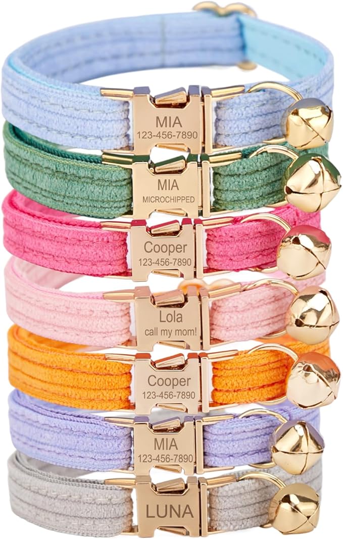 Personalized Cat Collar with Engraved Buckle – Custom Adjustable Kitten Collar with Bell, Choose Buckle Color or Breakaway Safety Design (Corduroy)