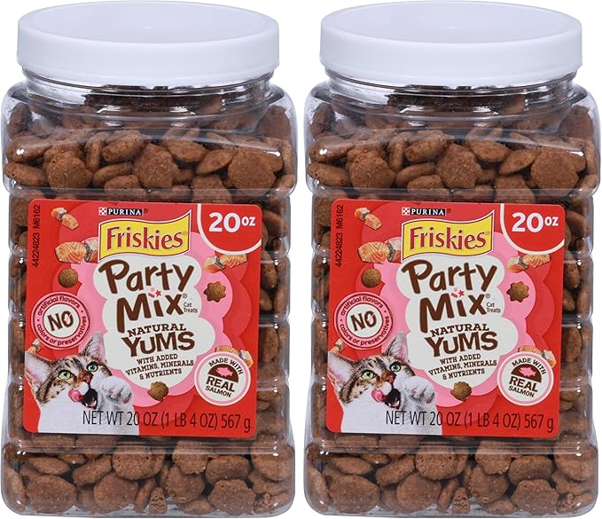 Friskies Purina Natural Cat Treats Party Mix Natural YUMS with Real Salmon and Added Vitamins, Minerals and Nutrients - 20 Oz. Canister (Pack of 2)